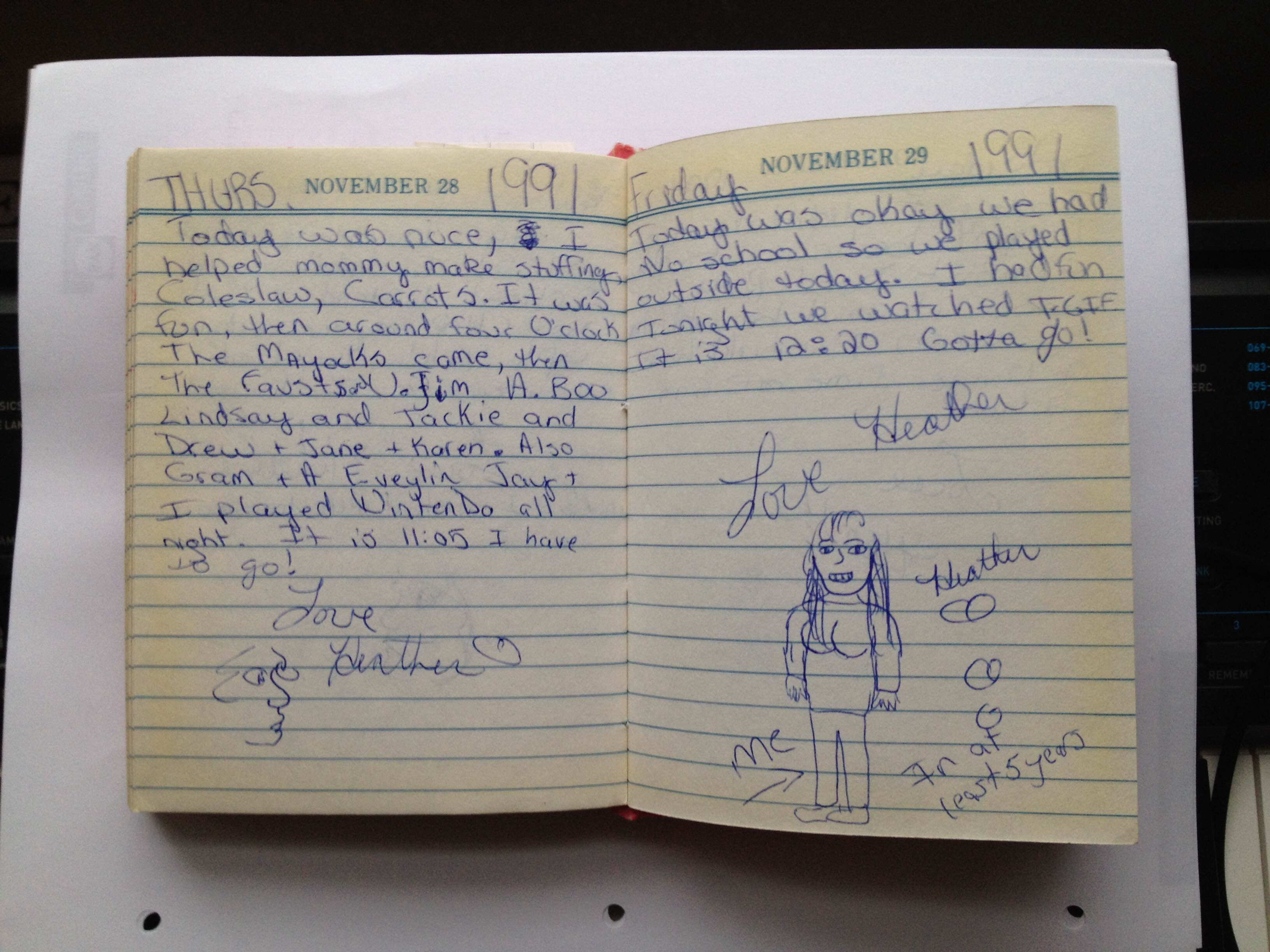 Today was nice, I helped Mommy make stuffing, coleslaw, carrots. it was fun. Then around four o’clock the Mayocks came, then the Fausts and Uncle Jim, Aunt Boo, Lindsay and Jackie and Drew + Jane + Karen. Also Gram and Aunt Evelyn. Jay and I played Nintendo all night.